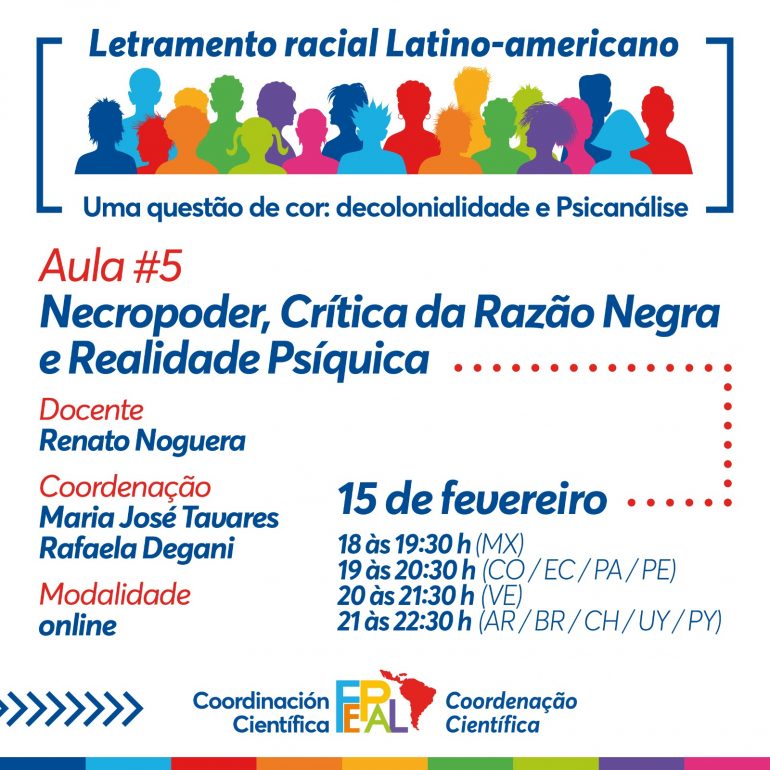 A aula é intitulada “Necropoder, crítica da razão negra e realidade psíquica”, ministrada por Renato Noguera.